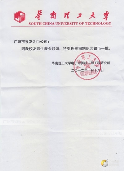 2012年10月:華南理工大學(xué)校友會(huì)設(shè)計(jì)定制紀(jì)念金銀幣制作
