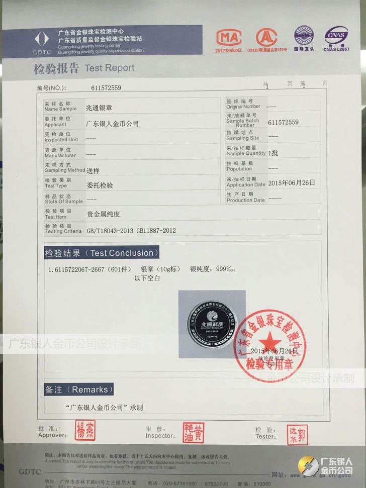 廣東銀人金幣公司承接客戶個性化定制的金銀幣、金銀章、金銀條、金銀牌、金銀盤均由國家質監部門、嚴格檢測、權威鑒定: