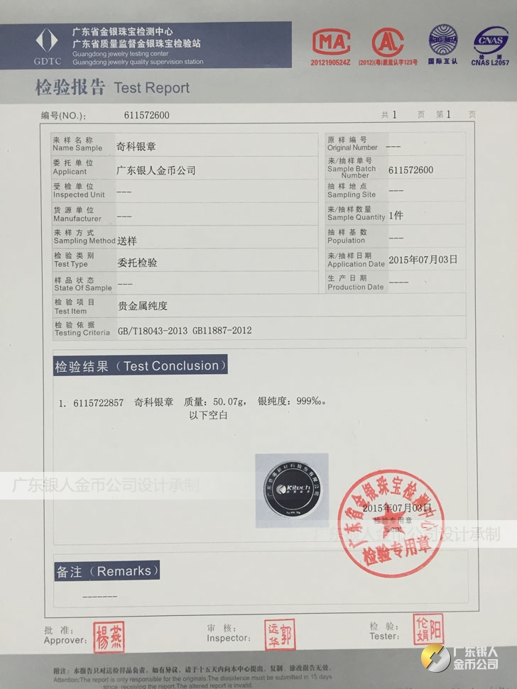 廣東銀人金幣公司承接客戶個性化定制的金銀幣、金銀章、金銀條、金銀牌、金銀盤均由國家質監部門、嚴格檢測、權威鑒定: