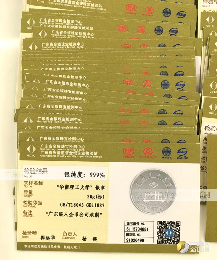 廣東銀人金幣公司承接客戶個性化定制的金銀幣、金銀章、金銀條、金銀牌、金銀盤均由國家質監部門、嚴格檢測、權威鑒定: