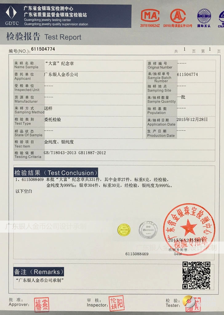 廣東銀人金幣公司承接客戶(hù)個(gè)性化定制的金銀幣、金銀章、金銀條、金銀牌、金銀盤(pán)均由國(guó)家質(zhì)監(jiān)部門(mén)、嚴(yán)格檢測(cè)、權(quán)威鑒定: