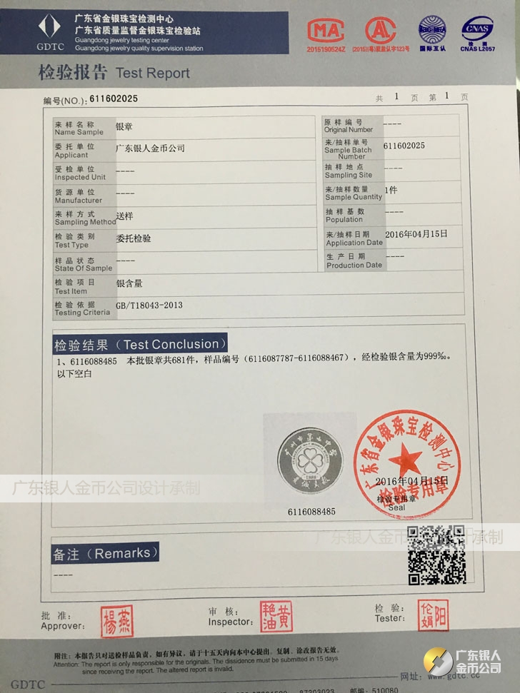 廣東銀人金幣公司承接客戶個性化定制的金銀幣、金銀章、金銀條、金銀牌、金銀盤均由國家質監部門、嚴格檢測、權威鑒定: