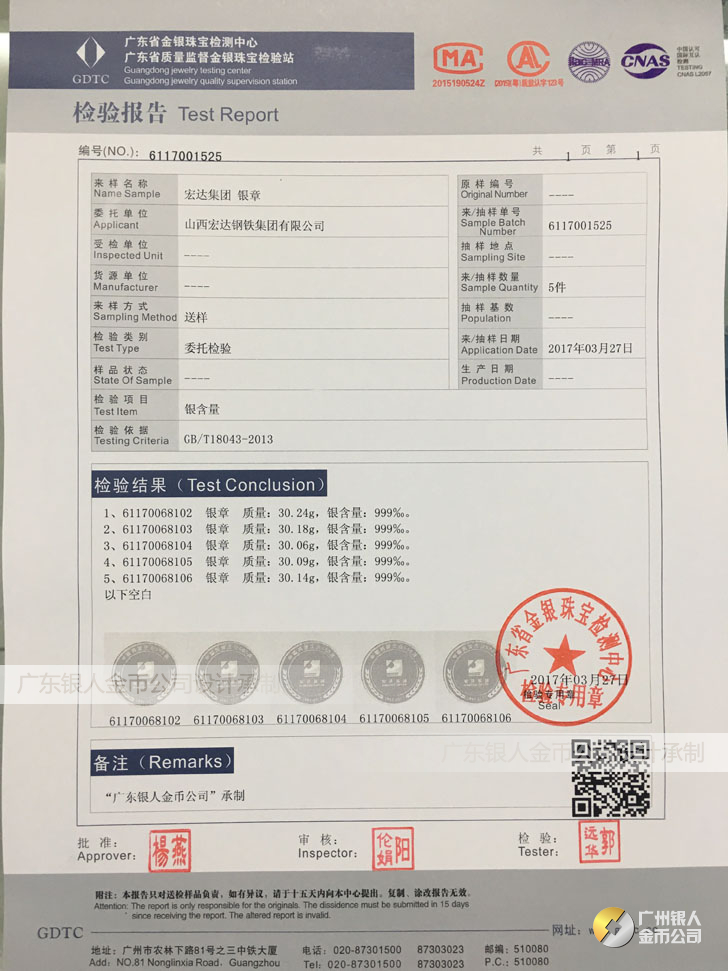 廣東銀人金幣公司承接客戶個性化定制的金銀幣、金銀章、金銀條、金銀牌、金銀盤均由國家質監部門、嚴格檢測、權威鑒定: