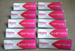 海爾集團——為集團公司制作員工佩戴的員工胸卡、有機玻璃胸卡、以及工作人員使用的水晶工作牌、銷售賣場營業(yè)員胸牌、導購員水晶胸牌。