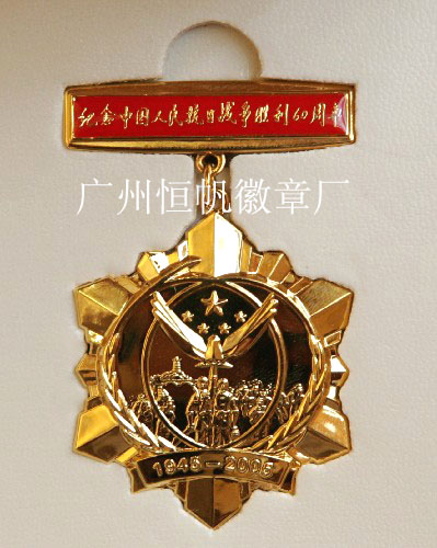 胡錦濤總書記題寫了“紀念中國人民抗日戰(zhàn)爭勝利60周年”的章名。紀念章為六組利劍組成一個六角形徽章基座,正面鑄有象征中國共產(chǎn)黨領(lǐng)導的革命人民大團結(jié)的5顆五角星、象征人類和平的鴿子和橄欖枝、象征革命圣地的延安寶塔山,以及軍民合力抗戰(zhàn)的戰(zhàn)斗場面。六組利劍表示武裝斗爭,向內(nèi)的合力象征抗日民族統(tǒng)一戰(zhàn)線;5顆五角星和延安寶塔山表示中國共產(chǎn)黨在全民族團結(jié)抗戰(zhàn)中的中流砥柱作用;和平鴿展開的雙翅構(gòu)成“VICTORY(勝利)”的第一個字母“V”,象征抗戰(zhàn)勝利;沖鋒陷陣的作戰(zhàn)場面表現(xiàn)了中華民族抗戰(zhàn)的英勇精神;手持大刀的八路軍戰(zhàn)士和手拿地雷的老百姓顯示了軍民團結(jié)抗戰(zhàn)的強大力量。本章直徑50mm,厚3.0mm,主章為鋁合金,鍍24k金。