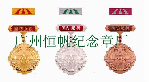 (從左至右分別為國防服役金質(zhì)紀(jì)念章、國防服役銀質(zhì)紀(jì)念章、國防服役銅質(zhì)紀(jì)念章。)