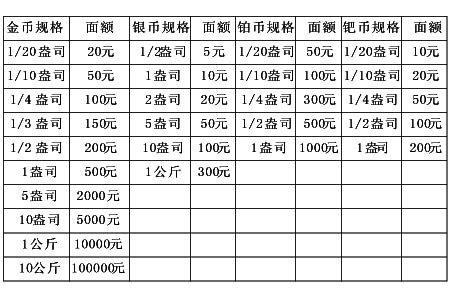 中國人民銀行自2000年發行 “千年紀念”金銀幣開始,規范統一了貴金屬紀念幣各種材質的規格品種與其標注面額的標準。具體見下表: