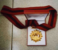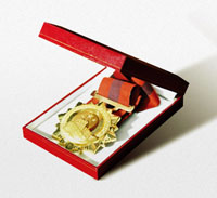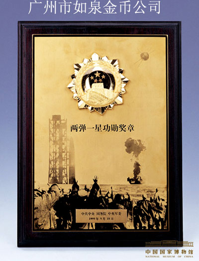 該獎章直徑8厘米,用99.9%純金鑄造,重量515克,配有綬帶,可懸掛佩于胸前。獎章主體圖案由五星、長城、橄欖枝和光芒線.成:獎章中心的五星代表中華人民共和國;長城既象征著中華民族堅強不屈的精神,又象征著共和國堅不可摧的國防;橄欖枝則表明我國研制“兩彈一星”的目的是為了維護世界和平。獎章配有江澤民同志親筆簽章的證書,并用紅木盒包裝。其規(guī)格、材質(zhì)、圖案和證書等方面,突出了這是共和國最高等級獎章的特征。該獎章設計端莊、章型宏偉、制作精良、包裝華麗,堪稱我國歷史上最為精美絕倫的勛章,更由于數(shù)量僅有23枚,極為珍罕。