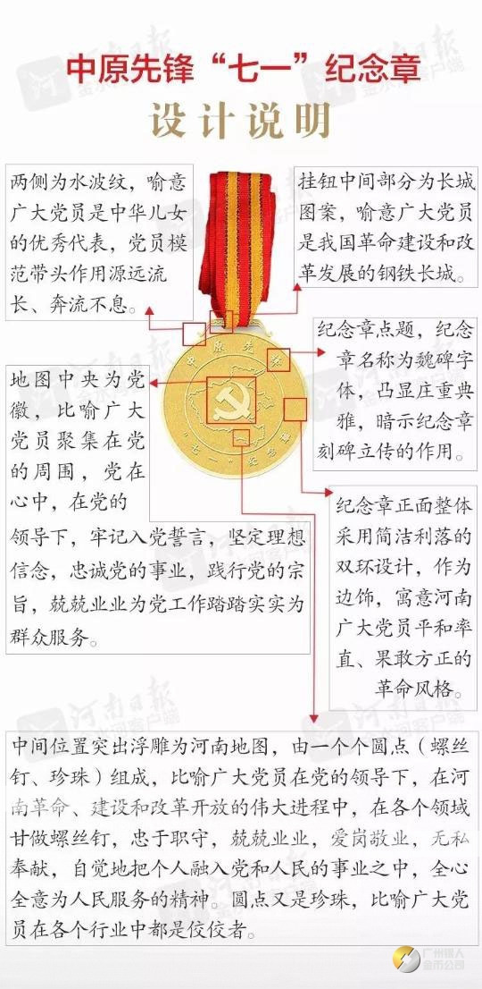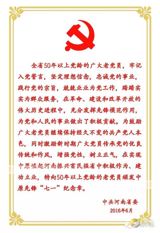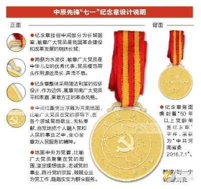 為50年以上黨齡老黨員頒發(fā)“七一”紀(jì)念章,在我省尚屬首次。省委組織部負(fù)責(zé)同志介紹說(shuō),中原先鋒“七一”紀(jì)念章的設(shè)計(jì)方案,是經(jīng)省委主要領(lǐng)導(dǎo)親自審定的。這個(gè)紀(jì)念章,蘊(yùn)含著省委對(duì)50年以上黨齡老黨員幾十年來(lái)忠誠(chéng)黨的事業(yè)、踐行黨的宗旨、兢兢業(yè)業(yè)為黨工作、踏踏實(shí)實(shí)為群眾服務(wù)的敬重和肯定,同時(shí)也傳遞著省委對(duì)老黨員的關(guān)心、愛(ài)護(hù)與牽掛。省委希望通過(guò)向老黨員頒發(fā)“七一”紀(jì)念章,鼓勵(lì)廣大老黨員繼續(xù)保持經(jīng)久不變的共產(chǎn)黨人本色,同時(shí)激勵(lì)新時(shí)期廣大黨員傳承黨的優(yōu)良傳統(tǒng)和作風(fēng),增強(qiáng)黨性,樹立正氣,在實(shí)現(xiàn)中原崛起河南振興富民強(qiáng)省進(jìn)程中積極作為、建功立業(yè)。據(jù)悉,黨組織關(guān)系在河南且有50年以上黨齡,能夠自覺(jué)遵守黨章黨規(guī),認(rèn)真參加組織生活,按期繳納黨費(fèi)的老黨員都在頒發(fā)“七一”紀(jì)念章的范圍內(nèi),全省共有26.7萬(wàn)名老黨員符合頒發(fā)條件。“七一”前后,各級(jí)黨組織將通過(guò)舉行頒發(fā)儀式、走訪慰問(wèn)、召開(kāi)座談會(huì)等多種形式,為各地的老黨員頒發(fā)紀(jì)念章。今后,在黨的生日逢5周年、逢10周年,省委都將向符合條件的老黨員頒發(fā)紀(jì)念章。