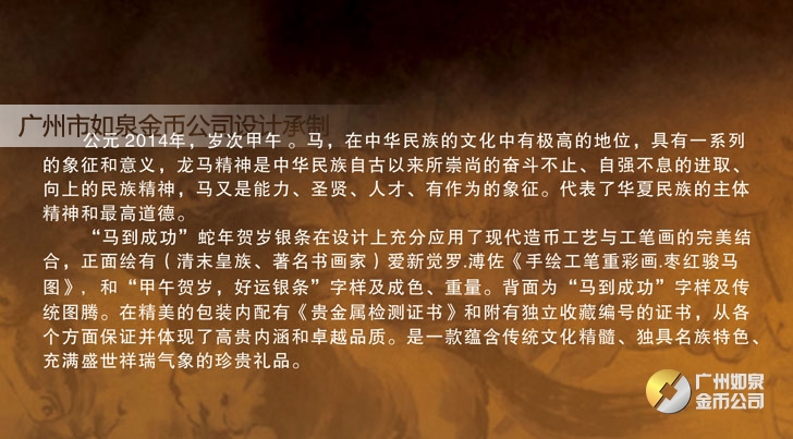 廣州市如泉金幣公司依托上海造幣廠和深圳國(guó)寶造幣廠等造幣公司以及金銀制品廠,設(shè)計(jì)定做紀(jì)念幣、紀(jì)念章、金銀幣、金銀章、金銀條,采用造幣工藝、選用千足金銀,個(gè)性定制金幣、定做銀幣、訂做金條、訂制銀條、制作紀(jì)念銀幣、制造紀(jì)念金幣、加工紀(jì)念銀章、生產(chǎn)紀(jì)念金章,純金純銀鑄造、全部國(guó)檢、權(quán)威檢測(cè)。