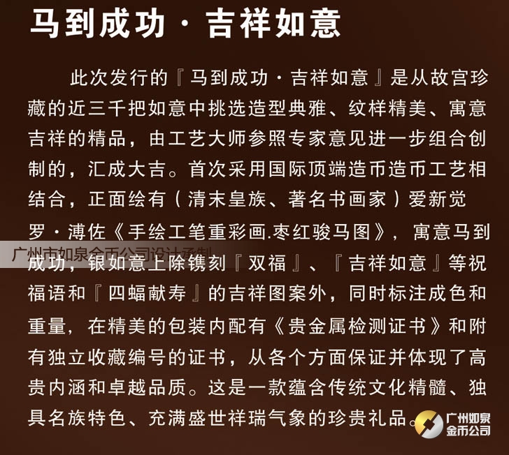 廣州市如泉金幣公司依托上海造幣廠和深圳國寶造幣廠等造幣公司以及金銀制品廠,設計定做紀念幣、紀念章、金銀幣、金銀章、金銀條,采用造幣工藝、選用千足金銀,個性定制金幣、定做銀幣、訂做金條、訂制銀條、制作紀念銀幣、制造紀念金幣、加工紀念銀章、生產紀念金章,純金純銀鑄造、全部國檢、權威檢測。